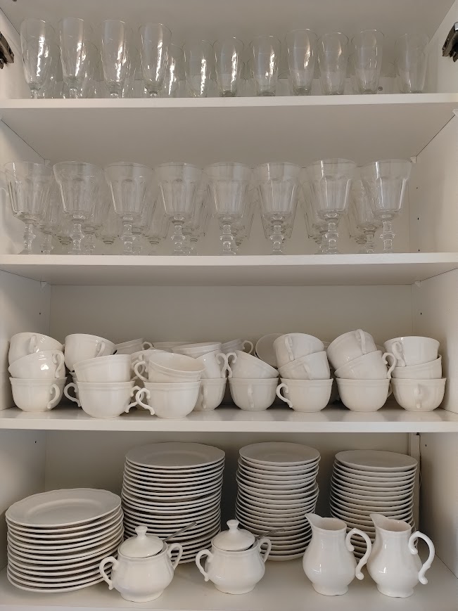 Käytettävissäsi on kaunis 40 hengen astiasto (ruokalautaset, leipälautaset, keittolautaset, kahvikupit, kakkulautaset, kermakko ja sokerikko sekä tarjoilulautaset) sekä juomalaseja ja kuohuviinilaseja. Myös kakkukupu löytyy.